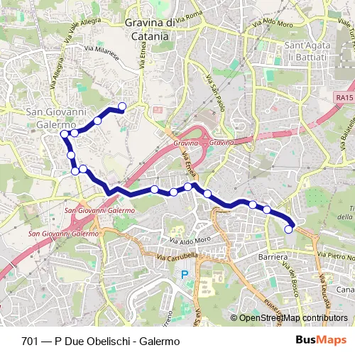 The first stop of the 701 bus route is Parcheggio Due Obelischi and the last stop is Unione Europea. 701 (P Due Obelischi - Galermo) is operational during tutti i giorni.