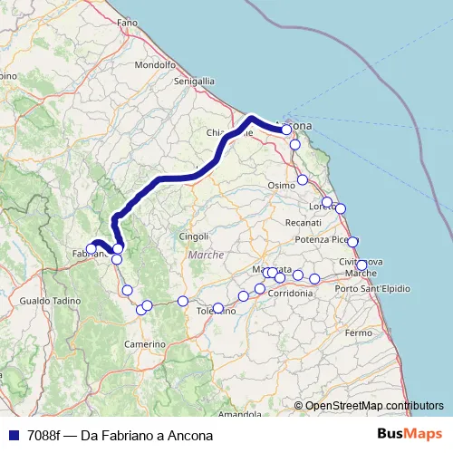 The first stop of the 7088f rail route is Fabriano and the last stop is Ancona. 7088f (Da Fabriano a Ancona) is operational during tutti i giorni.