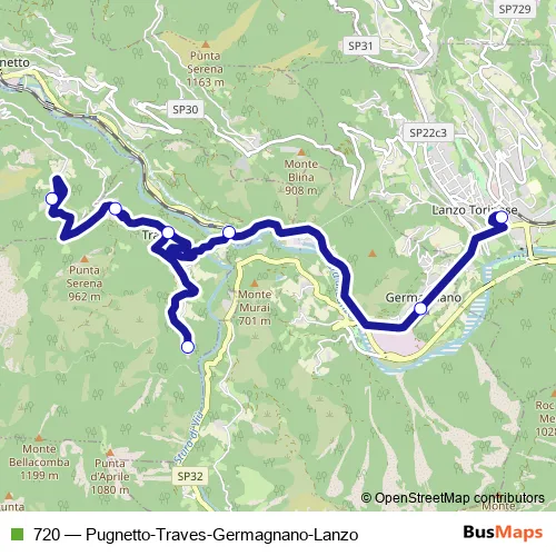The first stop of the 720 bus route is Lanzo Torinese - Movicentro and the last stop is Pugnetto. 720 (Pugnetto-Traves-Germagnano-Lanzo) is operational during tutti i giorni.