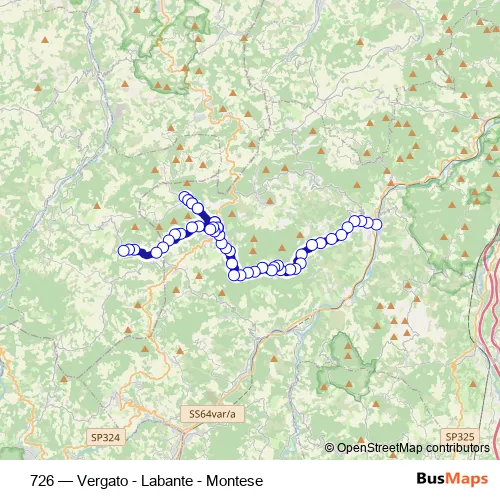 The first stop of the 726 bus route is Vergato Terminal and the last stop is Montese. 726 (Vergato - Labante - Montese) is operational during tutti i giorni.