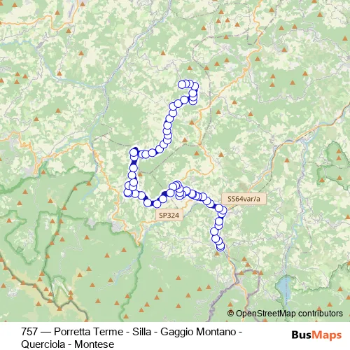 The first stop of the 757 bus route is Porretta Terminal and the last stop is Montese. 757 (Porretta Terme - Silla - Gaggio Montano - Querciola - Montese) is operational during tutti i giorni.