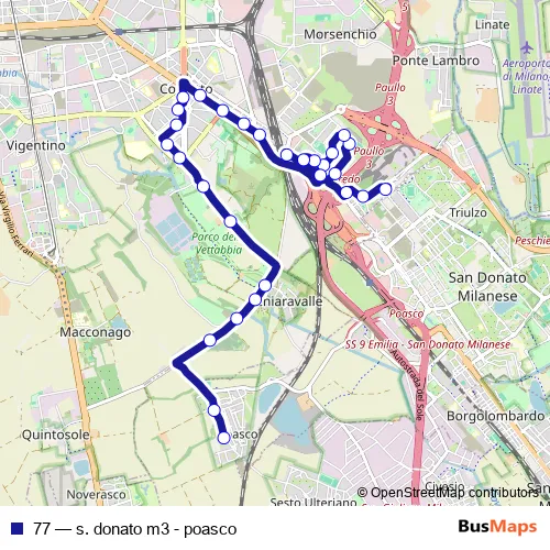 The first stop of the 77 bus route is san donato m3 and the last stop is via unica poasco via don milani (s.donato). 77 (s. donato m3 - poasco) is operational during tutti i giorni.