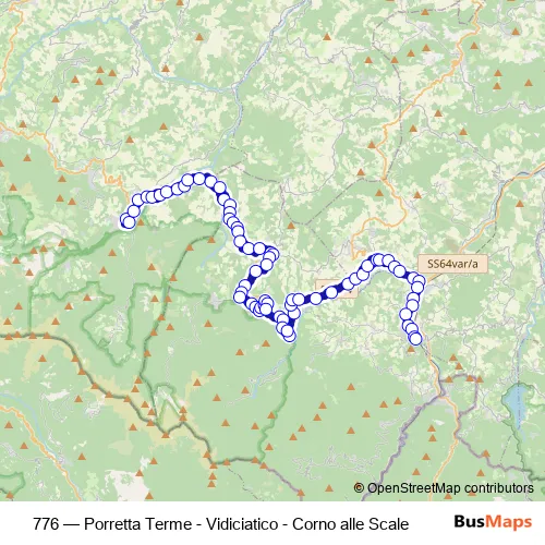 The first stop of the 776 bus route is Fanano and the last stop is Porretta Terminal. 776 (Porretta Terme - Vidiciatico - Corno alle Scale) is operational during tutti i giorni.
