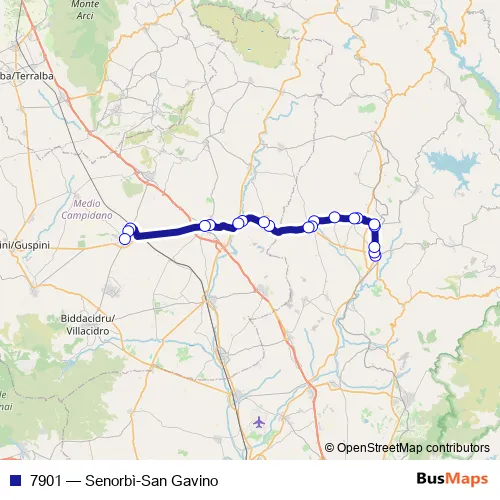 The first stop of the 7901 bus route is Fermata di Senorbi' VIA Carlo Sanna FR 68 and the last stop is Fermata di SAN Gavino EX Stazione (SAN Gavino Monreale). 7901 (Senorbì-San Gavino) is operational during tutti i giorni.