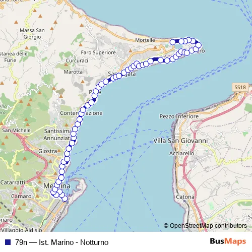 The first stop of the 79n bus route is Cavallotti and the last stop is Torre Faro, istituto Marino. 79n (Ist. Marino - Notturno) is operational during tutti i giorni.