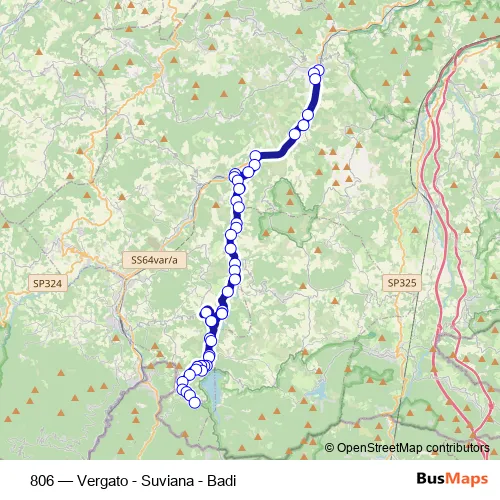 The first stop of the 806 bus route is Vergato Terminal and the last stop is Badi. 806 (Vergato - Suviana - Badi) is operational during tutti i giorni.