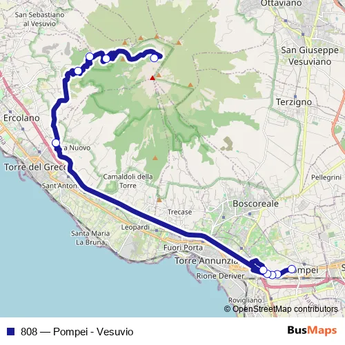 The first stop of the 808 bus route is Pompei - P.zza Anfiteatro Cl and the last stop is Ercolano - Vesuvio Cl. 808 (Pompei - Vesuvio) is operational during tutti i giorni.