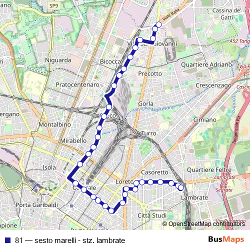 The first stop of the 81 bus route is sesto marelli m1 and the last stop is stazione lambrate m2. 81 (sesto marelli - stz. lambrate) is operational during tutti i giorni.