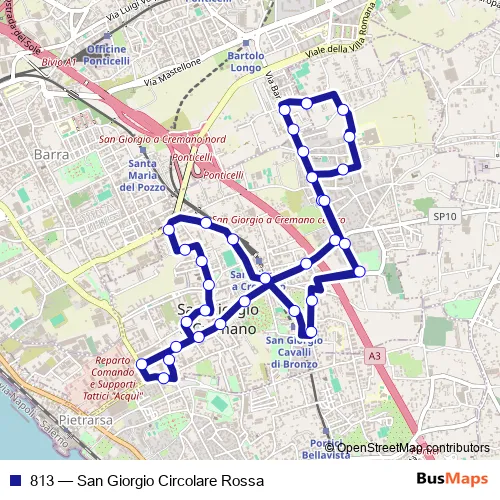 The first stop of the 813 bus route is San Giorgio a Cr. - Via Tufarelli and the last stop is San Giorgio a Cr. - Via Tufarelli. 813 (San Giorgio Circolare Rossa) is operational during tutti i giorni.