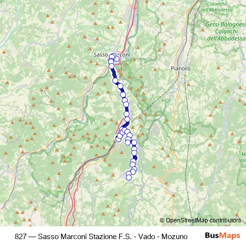 The first stop of the 827 bus route is Sasso M. Stazione and the last stop is Monzuno Municipio. 827 (Sasso Marconi Stazione F.S. - Vado - Mozuno) is operational during tutti i giorni.
