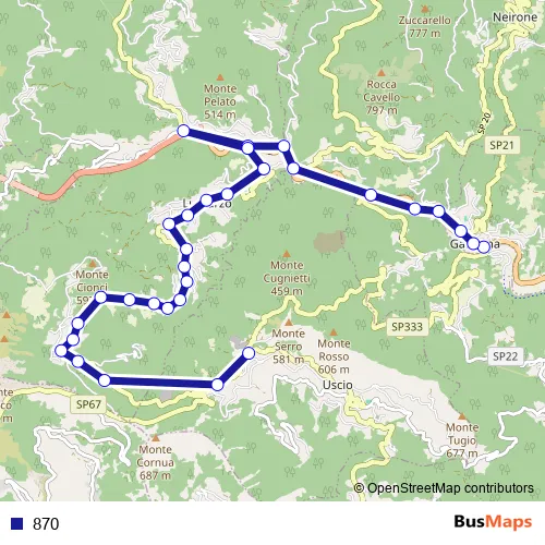 The first stop of the 870 bus route is Gattorna Ponte - Centro and the last stop is Via Colle Caprile 9 Colle Caprile. 870 is operational during tutti i giorni.