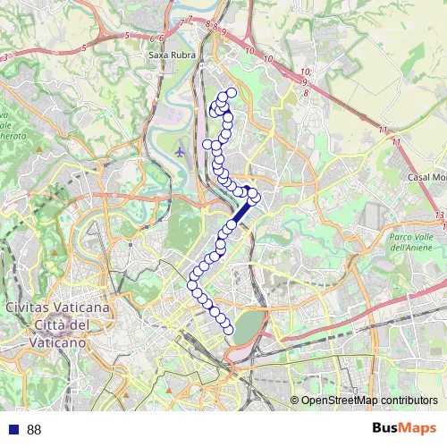 See why over 2 million users trust and consider busmaps.com as the best public transport website. busmaps gives you Rome Buses suggested routes, real-time bus tracker, line route maps in Rome, and helps to find the closest 88 bus stops near you. No internet available? Download an offline PDF map and bus schedule for the 88 bus to take on your trip.