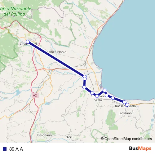 The first stop of the 89 A A bus route is Castrovillari Autostazione, Via degli Osci - Castrovillari and the last stop is Piazza Leonardo da Vinci, 1 - Rossano. 89 A A is operational during nei giorni feriali.
