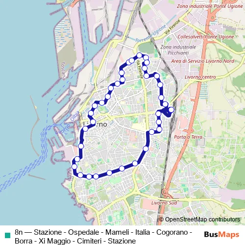 Bus 8n - Stazione - Ospedale - Mameli - Italia - Cogorano - Borra - Xi Maggio - Cimiteri - Stazione: Full Schedule in Livorno