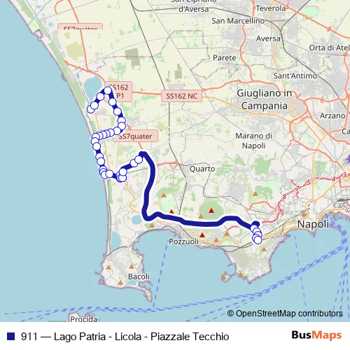 The first stop of the 911 bus route is Giugliano - Via Lago Patria, P.zza Tempio Scipione and the last stop is Napoli - Via Giulio Cesare, Santos. 911 (Lago Patria - Licola - Piazzale Tecchio) is operational during tutti i giorni.