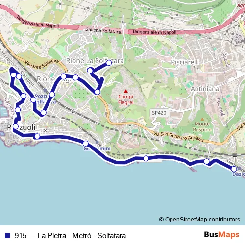 The first stop of the 915 bus route is Napoli - Dazio Capolinea staz. Cumana and the last stop is Pozzuoli - Largo Coste Di Agnano Cl. 915 (La Pietra - Metrò - Solfatara) is operational during tutti i giorni.