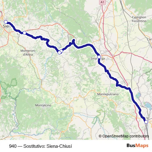 The first stop of the 940 bus route is Chiusi Stazione-P.Zza Dante and the last stop is Ferrovia. 940 (Sostitutivo: Siena-Chiusi) is operational during tutti i giorni.