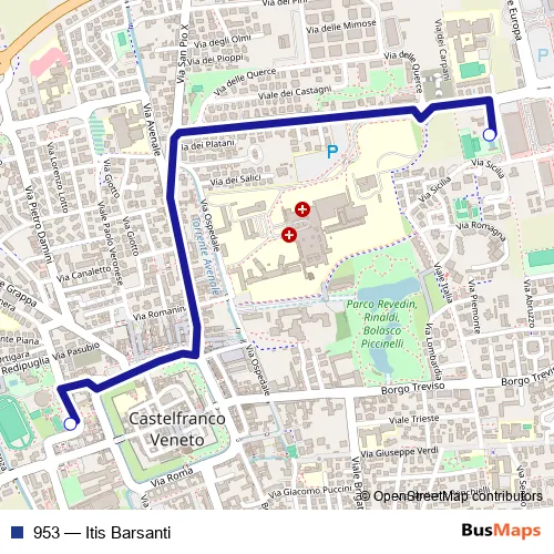 The first stop of the 953 bus route is Castelfranco Aut. p and the last stop is Itis VIA DEI Carpani. 953 (Itis Barsanti) is operational during tutti i giorni.