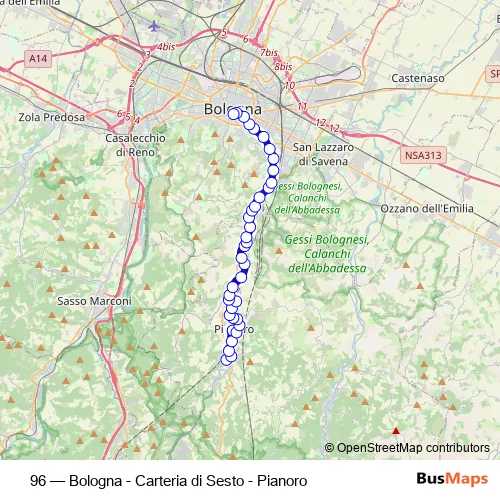 See why over 2 million users trust and consider busmaps.com as the best public transport website. busmaps gives you Bologna Buses suggested routes, real-time bus tracker, line route maps in Bologna, and helps to find the closest 96 bus stops near you. No internet available? Download an offline PDF map and bus schedule for the 96 bus to take on your trip.