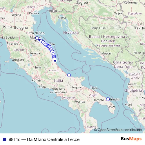 The first stop of the 9811c rail route is Rimini and the last stop is Brindisi. 9811c (Da Milano Centrale a Lecce) is operational during tutti i giorni.