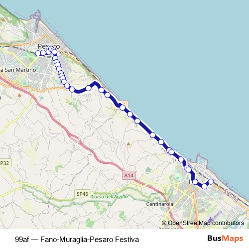 See why over 2 million users trust and consider busmaps.com as the best public transport website. busmaps gives you Pesaro Buses suggested routes, real-time bus tracker, line route maps in Pesaro, and helps to find the closest 99af bus stops near you. No internet available? Download an offline PDF map and bus schedule for the 99af bus to take on your trip.