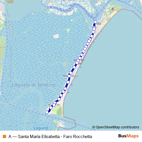 The first stop of the A bus route is Santa Maria Elisabetta and the last stop is Faro Rocchetta. A (Santa Maria Elisabetta - Faro Rocchetta) is operational during tutti i giorni.