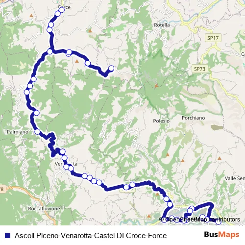 Additional information: Ascoli Piceno-Venarotta-Castel DI Croce-Force has 38 stops and the total trip duration for this route is approximately 62 minutes.