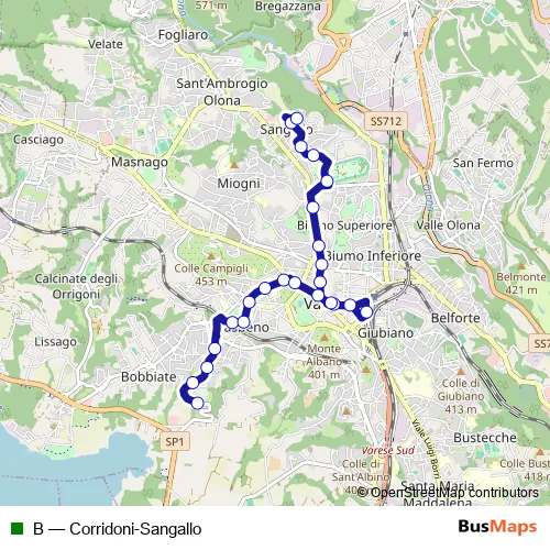 The first stop of the B bus route is Varese, Corridoni,piazzale capolinea and the last stop is Varese, Borromini/Sangallo. B (Corridoni-Sangallo) is operational during tutti i giorni.