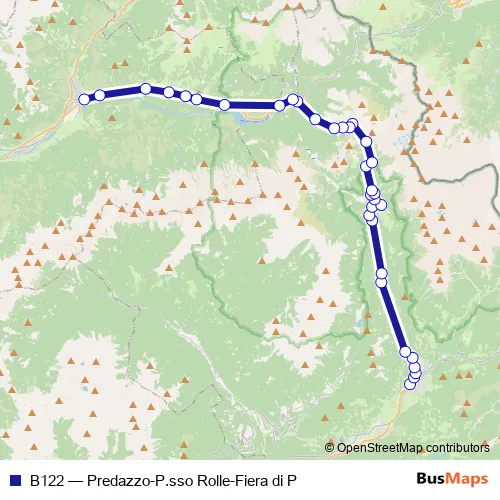 The first stop of the B122 bus route is Fiera di Primiero and the last stop is Predazzo. Autostazione. B122 (Predazzo-P.sso Rolle-Fiera di P) is operational during tutti i giorni.