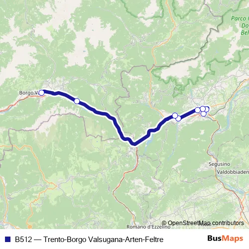 The first stop of the B512 bus route is Feltre-Staz. Fs and the last stop is Borgo Valsugana-C.Intermodale. B512 (Trento-Borgo Valsugana-Arten-Feltre) is operational during tutti i giorni.