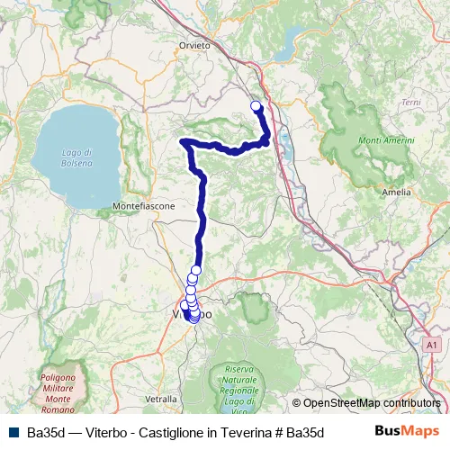 The first stop of the Ba35d bus route is Viterbo | Riello # f641 and the last stop is Castiglione | Piazza Repubblica # f1331. Ba35d (Viterbo - Castiglione in Teverina # Ba35d) is operational during nei giorni feriali.