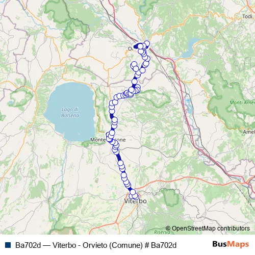 The first stop of the Ba702d bus route is Viterbo | Riello # f641 and the last stop is Orvieto | piazza d'Armi # f00036. Ba702d (Viterbo - Orvieto (Comune) # Ba702d) is operational during tutti i giorni.