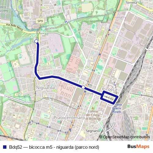 The first stop of the Bdq52 bus route is niguarda (parco nord) and the last stop is bicocca m5. Bdq52 (bicocca m5 - niguarda (parco nord)) is operational during nel fine settimana.