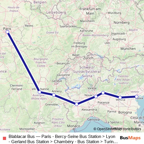 Bus Blablacar Bus - Paris - Bercy-Seine Bus Station > Lyon - Gerland Bus Station > Chambéry - Bus Station > Turin - Vittorio Emanuele Bus Station > Milan - Lampugnano Bus Station > Bergamo - Piazzale Marconi Bus Station > Verona - Bus Stop > Venice - Mestre Bus Station in Chambery: Stops & Timetable