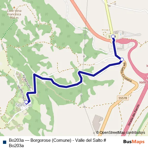The first stop of the Bo203a bus route is Borgorose | Spedino # f8321 and the last stop is Borgorose | Casello Valle del Salto # f8274. Bo203a (Borgorose (Comune) - Valle del Salto # Bo203a) is operational during tutti i giorni.
