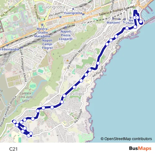 The first stop of the C21 bus route is Posillipo Capo - Attestamento and the last stop is Capolinea Mergellina. C21 is operational during tutti i giorni.