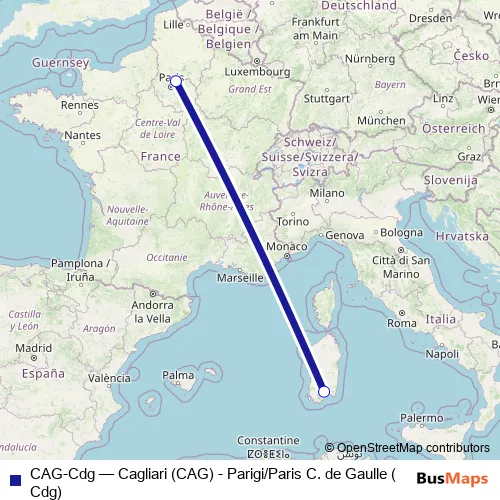 The first stop of the CAG-Cdg air route is Aeroporto di Cagliari (CAG) (Elmas) and the last stop is Aeroporto di Parigi/Paris C. de Gaulle (Cdg). CAG-Cdg (Cagliari (CAG) - Parigi/Paris C. de Gaulle (Cdg)) is operational during nel fine settimana.
