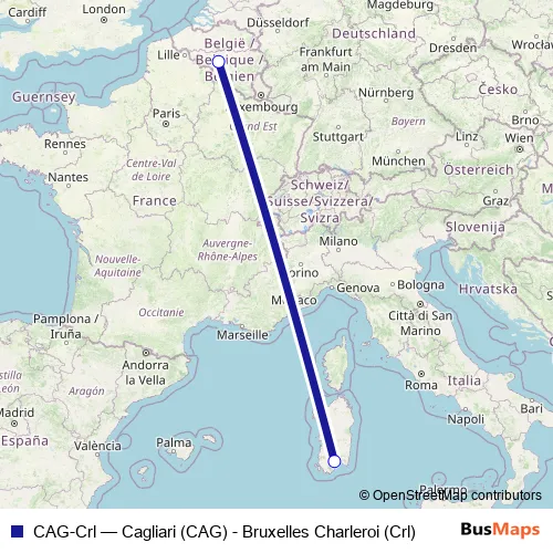 The first stop of the CAG-Crl air route is Aeroporto di Cagliari (CAG) (Elmas) and the last stop is Aeroporto di Bruxelles Charleroi (Crl). CAG-Crl (Cagliari (CAG) - Bruxelles Charleroi (Crl)) is operational during tutti i giorni.