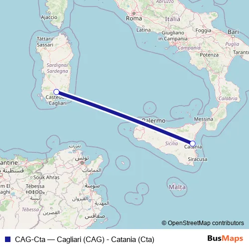The first stop of the CAG-Cta air route is Aeroporto di Catania (Cta) and the last stop is Aeroporto di Cagliari (CAG) (Elmas). CAG-Cta (Cagliari (CAG) - Catania (Cta)) is operational during tutti i giorni.