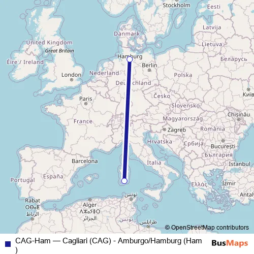 The first stop of the CAG-Ham air route is Aeroporto di Amburgo/Hamburg (Ham) and the last stop is Aeroporto di Cagliari (CAG) (Elmas). CAG-Ham (Cagliari (CAG) - Amburgo/Hamburg (Ham)) is operational during tutti i giorni.