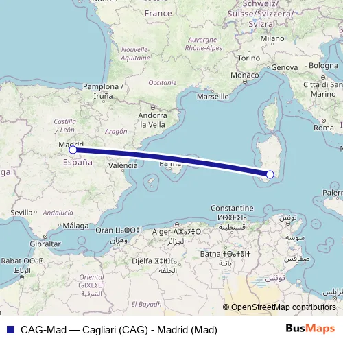 The first stop of the CAG-Mad air route is Aeroporto di Madrid (Mad) and the last stop is Aeroporto di Cagliari (CAG) (Elmas). CAG-Mad (Cagliari (CAG) - Madrid (Mad)) is operational during tutti i giorni.