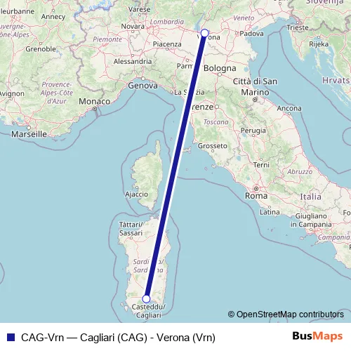 The first stop of the CAG-Vrn air route is Aeroporto di Cagliari (CAG) (Elmas) and the last stop is Aeroporto di Verona (Vrn). CAG-Vrn (Cagliari (CAG) - Verona (Vrn)) is operational during tutti i giorni.