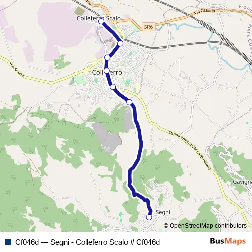 The first stop of the Cf046d bus route is Segni | Largo Sepe # f13787 and the last stop is Colleferro | Stazione FS # f4930. Cf046d (Segni - Colleferro Scalo # Cf046d) is operational during tutti i giorni.