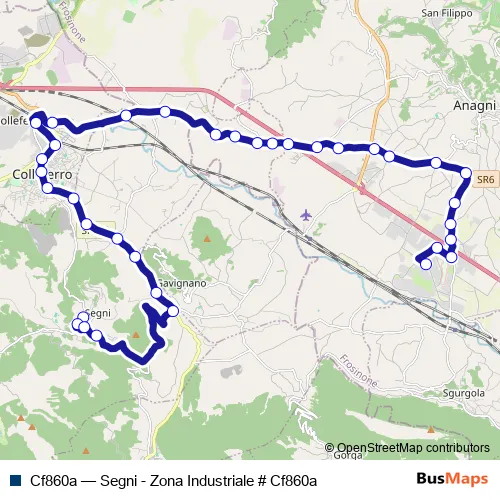 The first stop of the Cf860a bus route is Segni | Largo Sepe # f13787 and the last stop is Anagni | Augusta-Leonardo # f6222. Cf860a (Segni - Zona Industriale # Cf860a) is operational during nei giorni feriali.