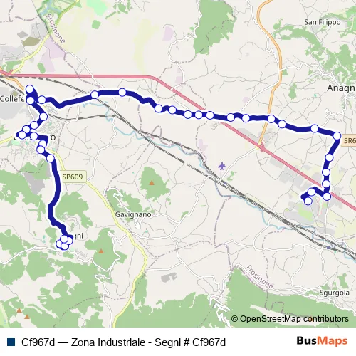 The first stop of the Cf967d bus route is Anagni | Augusta-Leonardo # f6222 and the last stop is Segni | Largo Sepe # f13787. Cf967d (Zona Industriale - Segni # Cf967d) is operational during nei giorni feriali.