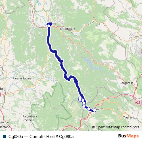 The first stop of the Cg080a bus route is Carsoli (AQ) | Stazione FS # f8688 and the last stop is Rieti | Via Sassetti Via Salaria # f1075. Cg080a (Carsoli - Rieti # Cg080a) is operational during tutti i giorni.