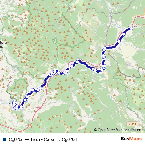 The first stop of the Cg626d bus route is Tivoli | Largo Saragat # f11701 and the last stop is Carsoli (AQ) | Stazione FS # f8688. Cg626d (Tivoli - Carsoli # Cg626d) is operational during tutti i giorni.