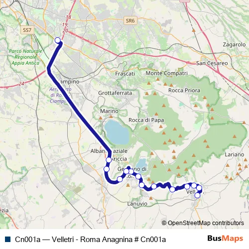 Click here to view the nearest Cn001a - Velletri - Roma Anagnina # Cn001a bus stop.