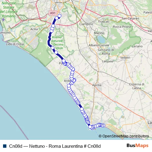 The first stop of the Cn08d bus route is Nettuno | Autostazione # f00095 and the last stop is Roma | Laurentina (Metro B) # f2693. Cn08d (Nettuno - Roma Laurentina # Cn08d) is operational during tutti i giorni.