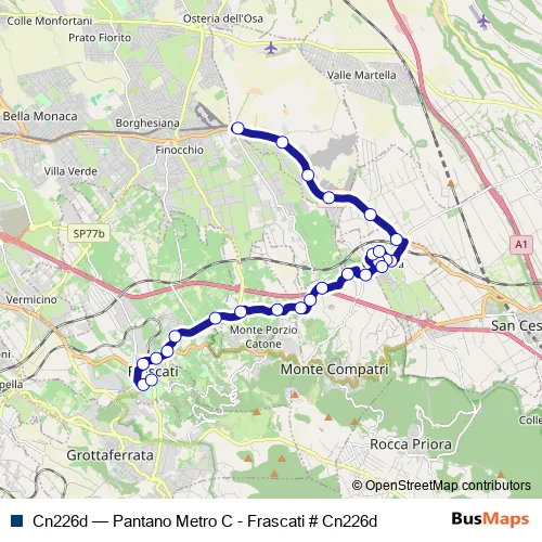 The first stop of the Cn226d bus route is Monte Compatri | Stazione Metro C # f00080 and the last stop is Frascati | Piazza Marconi # f12858. Cn226d (Pantano Metro C - Frascati # Cn226d) is operational during tutti i giorni.